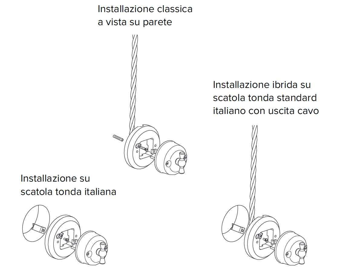 Può essere installata su scatola tonda italiana Ø 60 mm o direttamente a parete, grazie a due versioni – 1 e 2 posti – progettate per il massimo della flessibilità. Include passaggi pretagliati per la connessione con cavi intrecciati, con una struttura solida e funzionale pensata in ogni dettaglio. È ideale per ristrutturazioni d’epoca, case di charme e loft industriali dal design vintage, raffinati spazi commerciali.