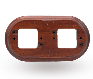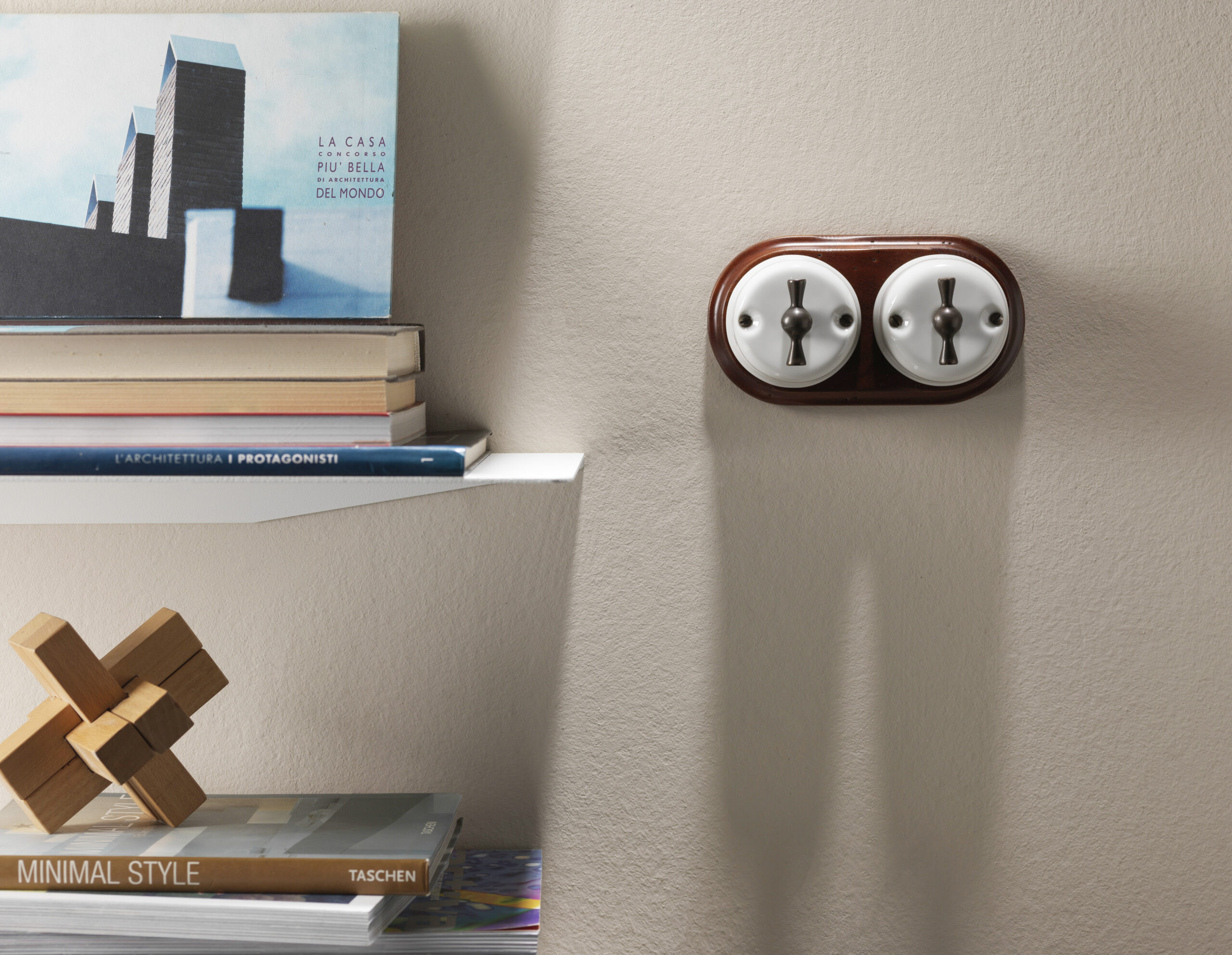 Gli interruttori presentano una base in noce anticato, materiale riconducibile a inizio Novecento; linee pulite, calde, essenziali accostano il rigore geometrico all’impronta rétro; un dettaglio esalta la calotta ed accompagna con naturalezza gli ambienti più sofisticati.